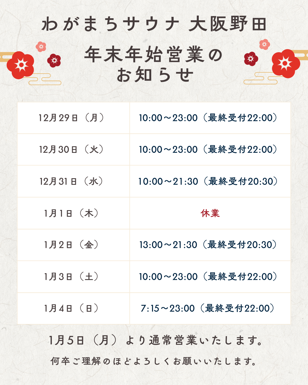 年末年始営業につきましては、下記のとおり営業いたします。