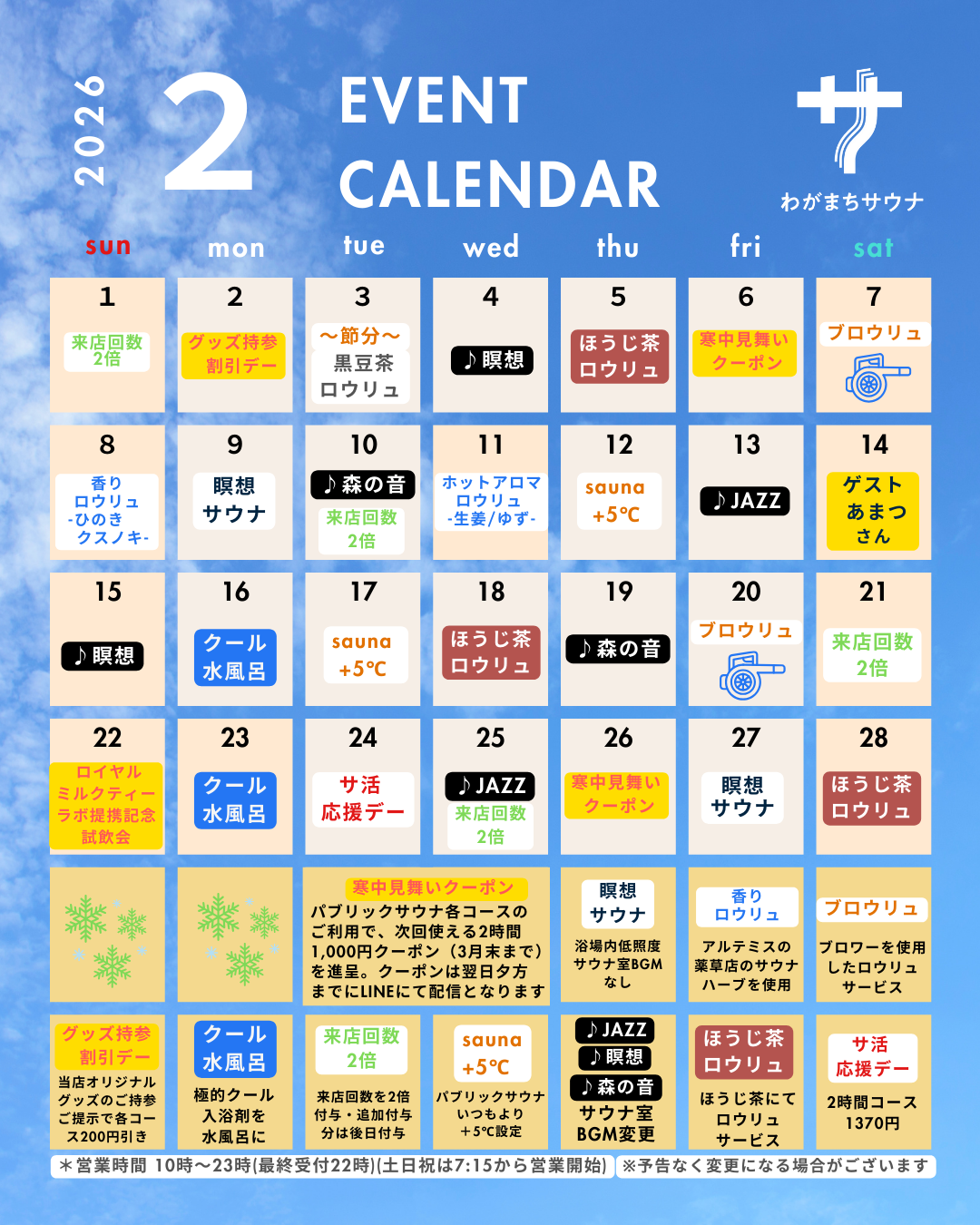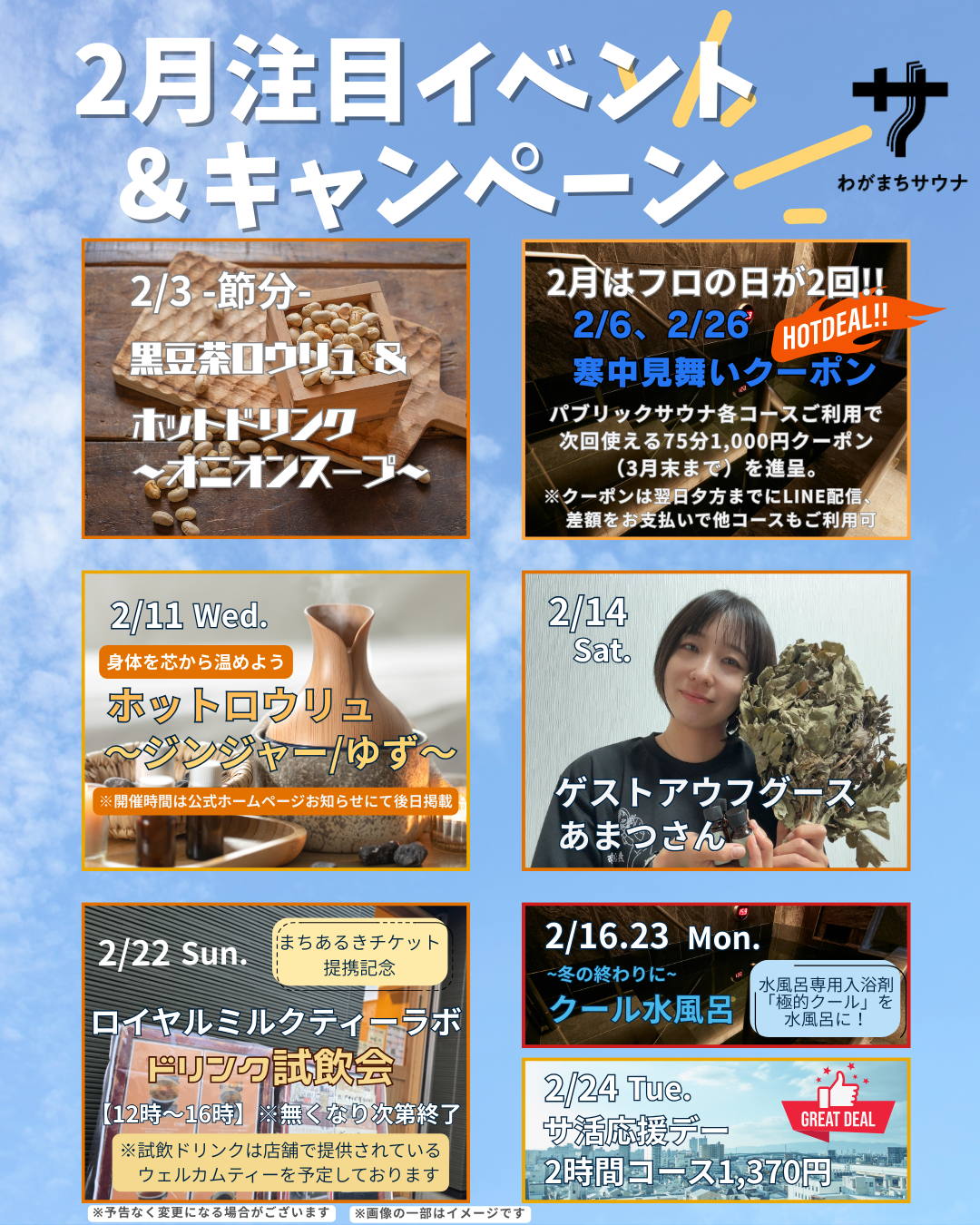毎日来ても楽しめるのが、わがまちサウナの2月です。