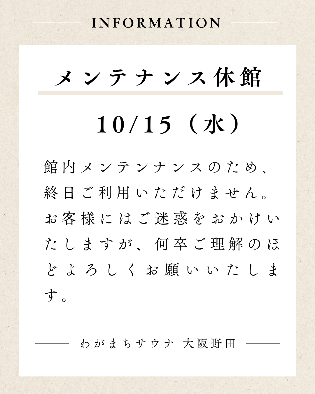 平素より「わがまちサウナ 大阪野田」をご利用いただき、誠にありがとうございます。