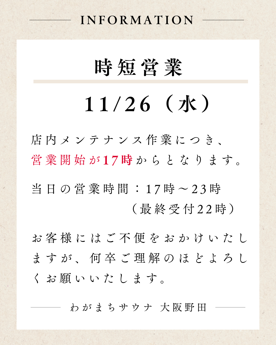 平素より「わがまちサウナ 大阪野田」をご利用いただき誠にありがとうございます。