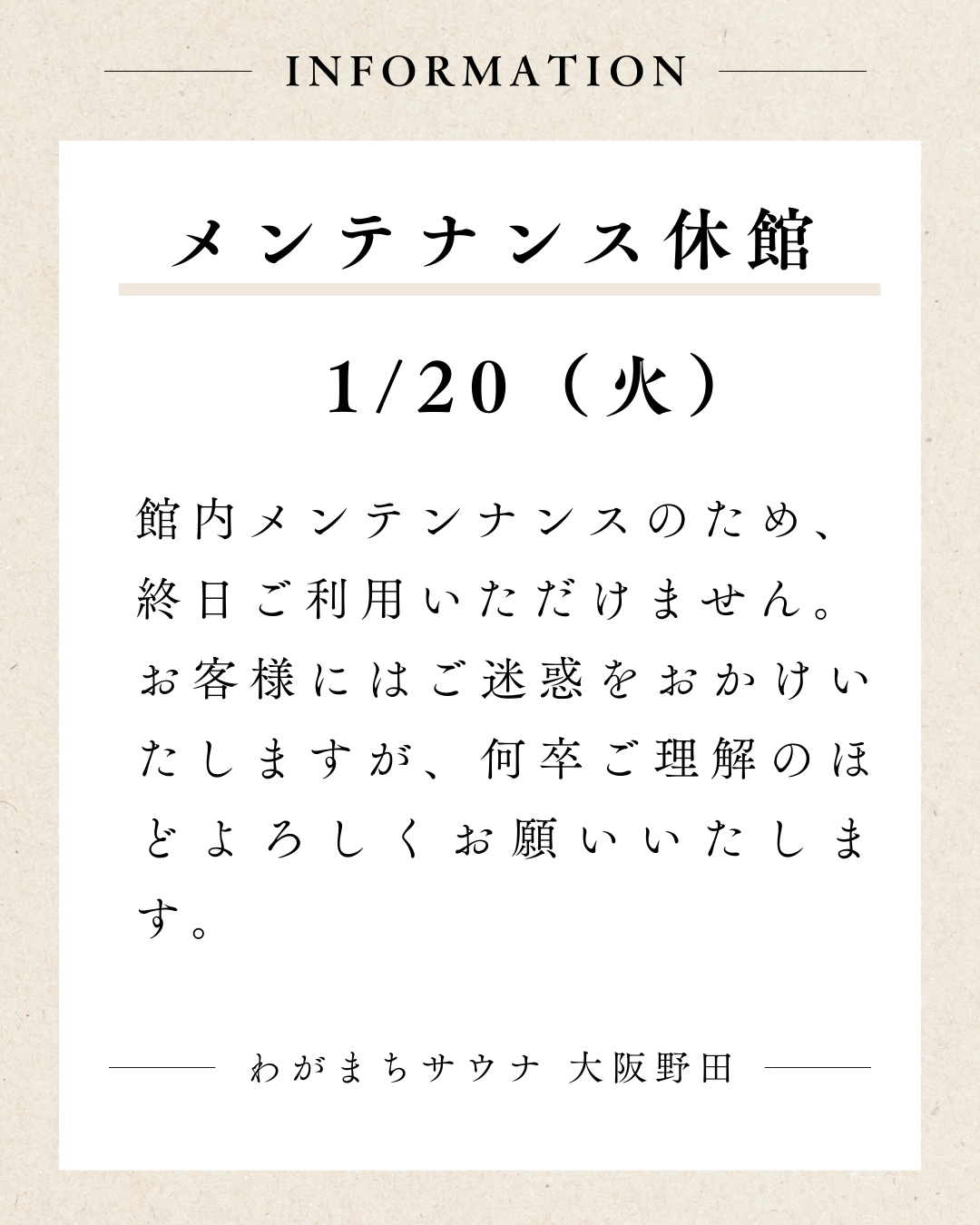 メンテナンス休館のお知らせ(1月20日)